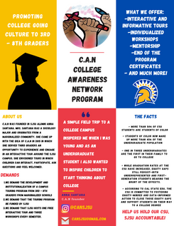What is College Awareness Network?History: Anna Santana, SJSU alumni, personally took on the role of gathering a group of 3rd graders in her graduating year of 2015-16....